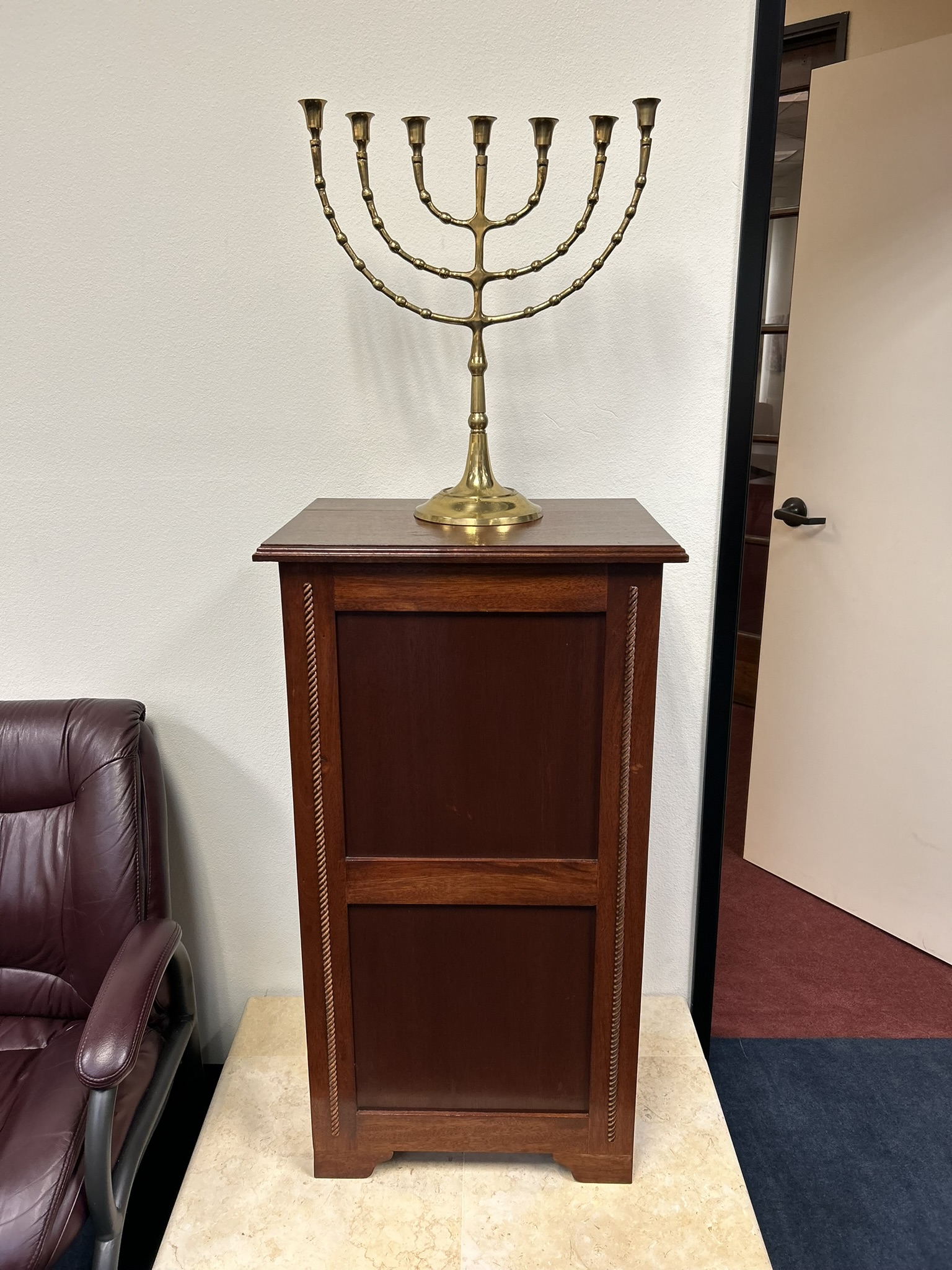 As you enter the Center’s sanctuary, on the back wall farthest from you when you enter, will be an armoire-type piece of furniture. This is called the ark. It is related to the Ark of the Covenant that was located in the Holy of Holies in the Tabernacle and Temple, but it is not the same as the ark that Moses made. This type of ark, found in Jewish synagogues, is called the Ark of Aaron. In traditional synagogues, this ark holds the Torah Scroll (the five books of Moses) which include Genesis, Exodus, Leviticus, Numbers, and Deuteronomy. Our ark at the Center contains the Ten Commandments and a wine chalice to represent the older and newer covenants. It also includes a Torah Scroll and a Codex of The Gospels that represents Yeshua (Jesus) as our Great High Priest who sits at the right hand of God as our advocate. We also have a budding almond branch, which represents the rod of Aaron that testifies of God's choice in whom will lead his people; Moses and Aaron of the old covenant who pre-shadowed, the son of God, Yeshua, in the New Covenant. Sitting atop the ark is a candle that is lit before every service representative of the eternal flame of God's glory and presence among us. And, hanging on the wall above the candle and ark is a banner that reads “da lifnei mi atah omed,” be aware before whom you stand.
